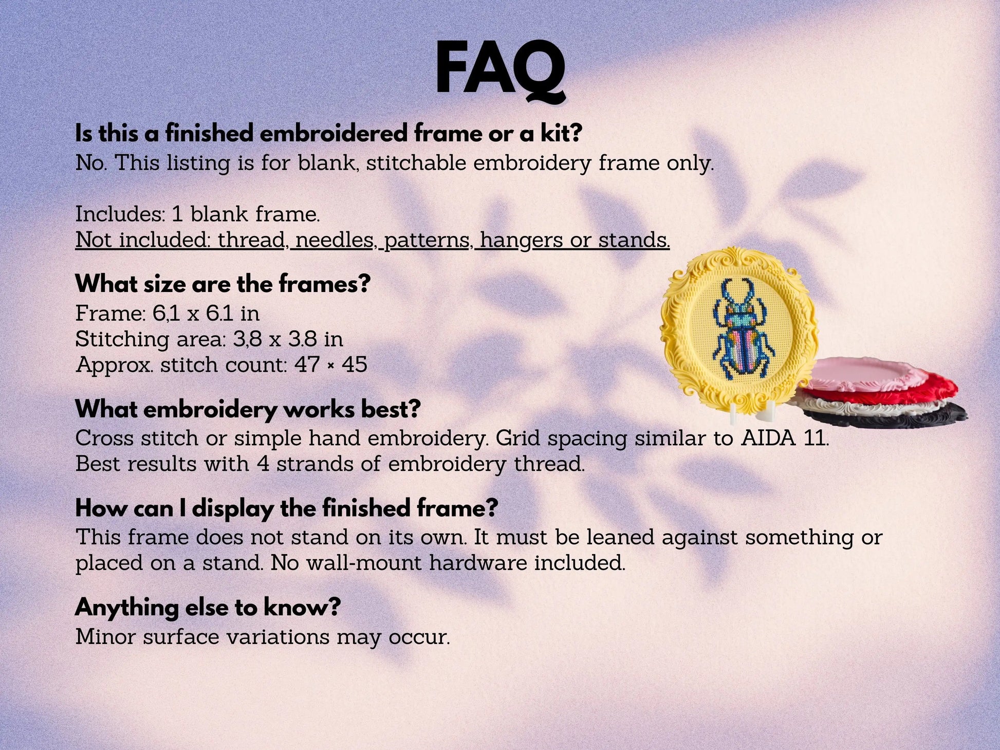 These frames are 3D printed. Minor color variations and fine layer lines may be visible up close. This is a normal part of the process and does not affect stitching or the finished result.